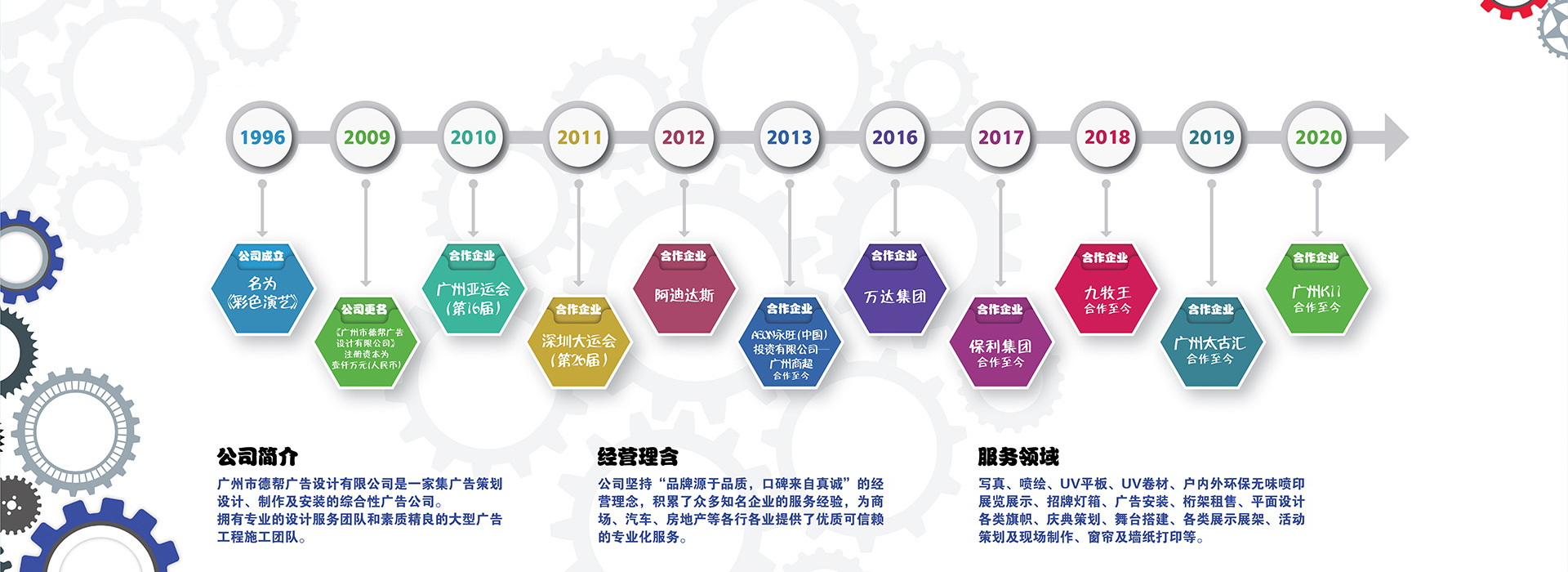 廣州市德幫廣告設(shè)計(jì)有限公司,是一家集廣告策劃 、設(shè)計(jì)及制作安裝于一體的綜合性廣告服務(wù)商,公司(原彩色演藝噴繪)成立于1996年,公司擁有惠普、愛(ài)普生戶(hù)內(nèi)外寫(xiě)真噴繪機(jī)20臺(tái),HP latex環(huán)保乳膠墨水打印機(jī)2臺(tái),大噴機(jī)10臺(tái),UV平板卷材機(jī)6臺(tái),全自動(dòng)智能切割機(jī)4臺(tái)等高端設(shè)備,專(zhuān)業(yè)的設(shè)計(jì)制作團(tuán)隊(duì)和素質(zhì)精良的大型廣告工程施工團(tuán)隊(duì),廠房面積達(dá)3000平米。公司主要經(jīng)營(yíng)戶(hù)內(nèi)、外寫(xiě)真、噴繪、廣告工程的制作、平面設(shè)計(jì)、燈箱、招牌等業(yè)務(wù),公司所有的設(shè)備采用進(jìn)口設(shè)備、后期制作自動(dòng)化,生產(chǎn)速度快、質(zhì)量第一。與方圓地產(chǎn)、萬(wàn)達(dá)廣場(chǎng)、招商地產(chǎn)、萬(wàn)科地產(chǎn)合作,主要制作內(nèi)容:廣告活動(dòng)物料、圍墻的生產(chǎn)、安裝、桁架的搭建、活動(dòng)執(zhí)行、高空安裝、燈旗的制作及安裝等業(yè)務(wù)。公司先后榮獲廣州地區(qū)十佳廣告工程制作公司、中國(guó)商務(wù)廣告協(xié)會(huì)廣告工程分會(huì)會(huì)員單位、全國(guó)噴繪企業(yè)入圍品牌公司等諸多榮譽(yù)。至今已發(fā)展成為華南地區(qū)大型的廣告產(chǎn)品供應(yīng)基地。并以“產(chǎn)量高、質(zhì)量好、交貨快”的經(jīng)營(yíng)模式贏得了廣大客戶(hù)的稱(chēng)贊。并堅(jiān)持“品牌源于品質(zhì),口碑來(lái)自真誠(chéng)”的經(jīng)營(yíng)理念,積累了眾多知名企業(yè)、政府機(jī)構(gòu)的服務(wù)經(jīng)驗(yàn),為大型活動(dòng)、商場(chǎng)超市、汽車(chē)、房地產(chǎn)等各行業(yè)提供了優(yōu)質(zhì)可靠的專(zhuān)業(yè)化廣告服務(wù)。旨在協(xié)助客戶(hù)提升品牌形象,并以建立長(zhǎng)期品牌價(jià)值為使命,讓各行業(yè)的品牌形象結(jié)合產(chǎn)品推向市場(chǎng),贏得足夠的社會(huì)關(guān)注,幫助企業(yè)品牌成長(zhǎng)。